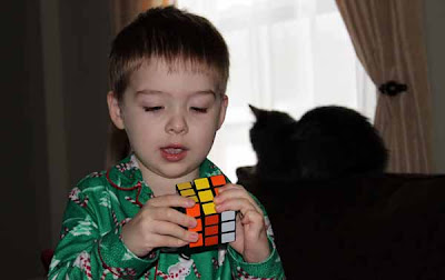 The day finally arrived. It took us 4 hours for him to open his gifts. He pondered them all and it was a pleasure to watch. It did become a little competitive in the Rubik Cube department. The neighbor cat has made a challenge but I don't think its fairl The feline has a head start.