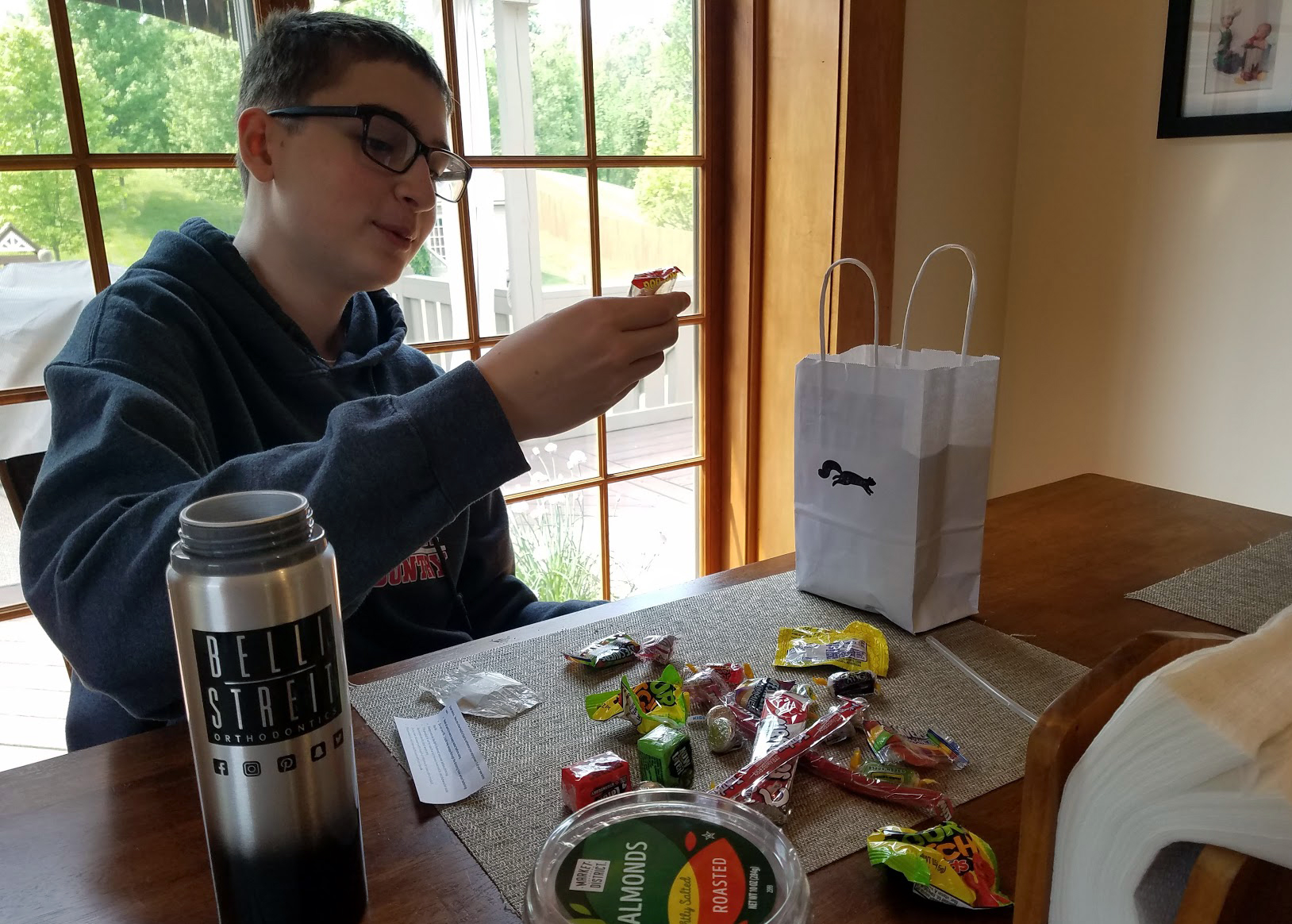 Afterword we had a party with the stickiest junk he could not eat for a year. The orthodontist beat us to it by giving him a thermos of chewy candy. Luke, of course, joined the action!
